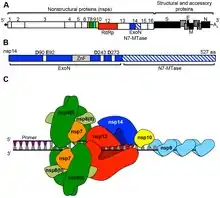 Après avoir synthétisé un antigénome, et avant de répliquer en série le génome viral, nsp12 produit des brins d'ARN viraux complémentaires dit subgénomiques qui serviront à la mise en production des 9 protéines accessoires (10, 9c, 9b, 8, 7b, 7a, 6, 3b et 3a) et des quatre protéines structurales (N, M, E et S) par les ribosomes[44]. Ces fractions du génome viral produites par nsp12 sont de taille variable mais comprennent toutes l'extrémité 3' du génome du SARS-CoV-2 et terminent toutes par l'ORF10. Sauf exception, seul l'ORF placé en tête au 5'terminal, est traduit[51]. À titre d'exemple, un brin d'ARN subgénomique qui permet de synthétiser l'ORF2 codant la protéine S, incorpore tous les autres ORF suivants liés aux protéines structurales et accessoires, mais les ribosomes ne synthétisent que la protéine S.