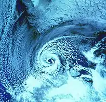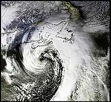 Un cyclone extratropical, parfois nommé cyclone des latitudes moyennes, est un système météorologique de basse pression, d'échelle synoptique, qui se forme entre la ligne des tropiques et le cercle polaire. Il est associé à des fronts, soit des zones de gradients horizontaux de la température et du point de rosée, que l'on nomme aussi « zones baroclines »[15]. Pour cette raison, ils sont dits à « noyau froid » car le centre du système se situe du côté froid des fronts et la tropopause plus basse (froide) que les régions à l'extérieur du système.
