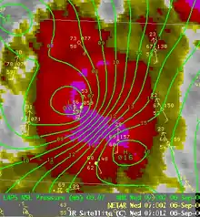 Une dépression dans le sillage est un autre type de zone dépressionnaire de méso-échelle à l'arrière d'une ligne de grain près du bord arrière de la zone de pluie stratiforme[19]. En raison de l'air chaud subsidant associé avec leur formation, l'air s'y assèche et le ciel se dégage. Des vents violents peuvent être notés à cause de la différence pression entre la dépression et l'anticyclone de méso-échelle qui existe sous le courant descendant de l'orage[20]. Lorsque la ligne de grains est en affaissement, un coup de chaleur peut être généré près de la dépression dans le sillage.