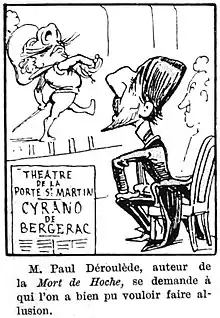 La critique se déchaîne soit pour l'encenser (tels Henry Bauër, Francisque Sarcey, Émile Faguet[28] ou Henry Fouquier[29], Jules Lemaître[11]...), soit pour l'éreinter (Ferdinand Hérold[30], René Doumic en 1900[31]), mais le public est lui aussi au rendez-vous ; la reconnaissance officielle est également de la partie. À la générale, entre les actes IV et V[11], le ministre des Finances Georges Cochery épingle sa propre Légion d'honneur sur la poitrine de l'auteur[32] en expliquant : « Je me permets de prendre un peu d'avance »[Note 2]. Le 1er janvier 1898, Rostand est fait officiellement chevalier de l'ordre ; le 6, le président de la République Félix Faure accompagné de sa famille assiste à la pièce. Un an après la création de son second succès, le drame L'Aiglon qu'il met en scène pour Sarah Bernhardt en 1900, Edmond Rostand est élu à l'Académie française[18].