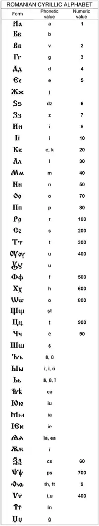 L'alphabet cyrillique roumain a été utilisé pour écrire la langue roumaine jusqu'en 1865. Cet alphabet est le suivant[1] :