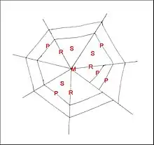 La toile de Pasilobus, longue d’environ 50 cm, a une charpente triangulaire, un moyeu totalement excentré à l’apex, un unique radius axial et, de ce fait, seulement deux secteurs traversés par quelques fils en pont (Fig.8). L’Araignée Pasilobus sp., étudiée en Nouvelle Guinée (Morobe District) par les Robinson (Robinson & Robinson, 1975)[12], construit cet édifice de nuit sur les arbustes et les petits arbres. Plus ou moins horizontal, cet édifice a une charpente triangulaire divisée en deux moitiés par un fil médian tendu de l’angle apical au milieu de la base, ainsi divisée. De ce fil axial pendent de 4 à 11 paires de fils en “pont” largement espacés. Seuls constituants adhésifs de la toile, ils sont visqueux dans une partie seulement de leur longueur, solidement fixés au seul niveau de leur jonction avec le fil médian mais, en revanche, sont facilement rompus à leur insertion sur le fil de charpente latéral ("low‐shear joint"). La toile de Paraplectana, telle que P. tsushimensis (Chigira, 1978), d’un diamètre moyen de 70 cm, a une charpente plus ou moins incomplète, un moyeu très excentré, 4 à 7 radii et des fils en pont dans les secteurs plus ou moins ouverts qu’ils délimitent (Fig.9).