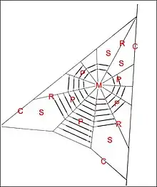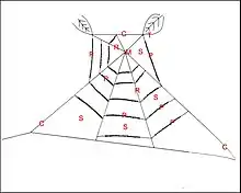 La toile des Cyrtarachne exotiques se compose d’une charpente de forme variable, en triangle ou en polygone plus complexe, de radii divergeant à partir d’un moyeu subcentral et de fils en pont pouvant former des cercles complets au travers des secteurs (Fig.6).
