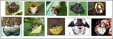 Chez la plupart des espèces de Cyrtarachninae, l’abdomen des femelles adultes est proportionnellement plus large que le céphalothorax qu’il tend à recouvrir en le dissimulant plus ou moins et peut être très étalé dans le sens transversal (Pasilobus) (fig.1,D). Sa forme globale et son ornementation, motifs et fond de couleurs vives, peuvent simuler certains insectes, par exemple des coccinelles (Paraplectana coccinella, Paraplectana tsushimensis) (Fig.1,C). Il peut également être pourvu de tubercules ou verrucosités de tailles, formes, coloris variés (Pasilobus bufoninus, Cyrtarachne inaequalis, C.bufo, Poecilopachys australasia) (Fig.1,B,E). Le prosoma ou céphalothorax peut également présenter des excroissances en tubercules ou cornes (Mastophora), ces dernières pouvant simuler une rangée d'épines (Cladomelea debeeri) (Fig.2).