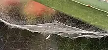 Il est totalement dépourvu de fils gluants et comporte une nappe horizontale de pourtour arrondi que soutiennent deux réseaux irréguliers, sus et sous-jacents. La nappe est formée d'innombrables radii et d'un fil spiral sans gouttelettes visqueuses, donc non adhésif. En se croisant, ces fils constituent un tissu robuste, avec des jonctions en nombre extraordinairement élevé et dont les petites mailles carrées sont si fines et si régulières qu'elles évoquent la structure d'un filet à plancton (Fig. 2). Le tissu s'incurve en dôme ou en entonnoir surbaissé, unique, mais pouvant être aussi multiple.