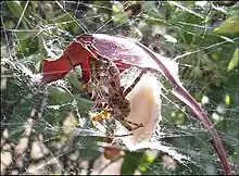 Du point de vue structural, chacune d'elles est un édifice soyeux tridimensionnel complexe, évoquant à première vue la construction habituelle des Linyphiidae, fort dissemblable de l'orbe classique tissée par les "Epeires" et les "Argiopes", de ce fait "aberrant" dans la famille des Araneidae surtout composée d'orbitèles typiques[9].