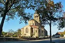 Cette église, construite dans le style roman bourguignon, date globalement du XIIe siècle. Le chœur à deux travées précède une profonde abside entourée d'un déambulatoire. C'est là, derrière l'autel, que se trouve, aujourd'hui, le sarcophage du saint ; ce dernier contient encore une partie des reliques, que quatre petites rosettes ajourées permettent d'entrevoir.
