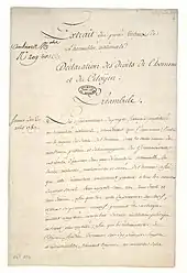 La Déclaration des droits de l'homme et du citoyen de 1789[N 1] (parfois abrégée en DDHC) est un texte fondamental de la Révolution française qui énonce un ensemble de droits naturels individuels et communs, ainsi que les conditions de leur mise en œuvre. Ses derniers articles sont adoptés le [A 1].