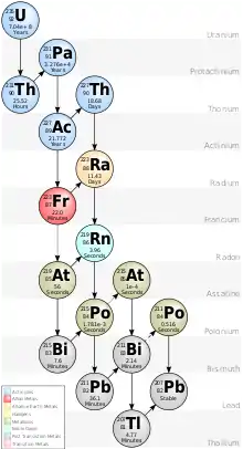 Lorsque le groupe de Rome est arrivé à l'uranium, ils ont rencontré un problème : la radioactivité de l'uranium naturel était presque aussi importante que celle de leur source de neutrons[44]. Ce qu'ils observaient était un mélange complexe de demi-vies. S'inspirant de la loi de déplacement radioactif, ils cherchaient du plomb, du bismuth, du radium, de l'actinium, du thorium ou du protactinium (en sautant les éléments dont les propriétés chimiques étaient alors inconnues) et ils n'ont trouvé, fort justement, aucune indication de leur présence[44]. Fermi connaissait trois types de réactions provoquées par l'irradiation neutronique : l'émission de particules alpha (n, α) ; l'émission de protons (n, p) ; et l'émission de rayons gamma (n, γ). Invariablement, les nouveaux isotopes se désintégraient par émission bêta, ce qui faisait remonter les éléments dans le tableau périodique[45].
