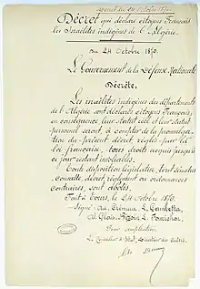 D'après Adolphe Crémieux[7], ce « deuxième » décret a été précédé de deux décrets qui n'ont pas été publiés au Bulletin des lois. Le premier d'entre eux, attesté par sa publication au Bulletin officiel du gouvernement général de l'Algérie, est le suivant :