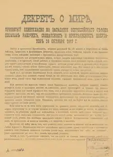 Le décret sur la paix est le premier décret du nouveau pouvoir bolchévique lors de la révolution d'Octobre. Rédigé par Lénine, le décret est adopté à l'unanimité par le Congrès des Soviets dès le 26 octobre 1917 ( dans le calendrier grégorien), après le renversement du Gouvernement provisoire russe .