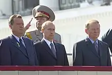 Répétition du Jour de l'Indépendance à Kiev le 22 août 2018 ; Petro Porochenko entouré de Stepan Poltorak et Viktor Moujenko. | |