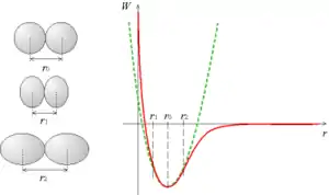 À une température de 0 K, la distance entre deux atomes est r0. Si l'on s'éloigne un peu de cette valeur, l'énergie W augmente ; on peut localement approcher la loi de W par une parabole (il s'agit en fait d'un développement limité au second ordre), on peut donc écrire :