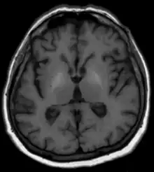 Les méthodes habituelles telles qu'analyses de sang, échographie et autres procédures d'imagerie par tomographie ainsi que la clinique[1] et, si nécessaire, une biopsie du foie avec examen histologique, sont disponibles pour diagnostiquer la maladie hépatique sous-jacente. En ce qui concerne la dégénérescence du cerveau, aucun changement n'est généralement visible sur la tomodensitométrie. L'IRM montre généralement une augmentation du signal dans les noyaux gris centraux sur les séquences natives pondérées en T1[1]. On soupçonne que la cause en est des dépôts de minéraux paramagnétiques, potentiellement réversibles après une transplantation hépatique[1],[2]. Les images pondérées T2 ne montrent généralement aucune anomalie. En termes de diagnostic différentiel, les changements de signal décrits ci-dessus sont parfois observés avec une nutrition parentérale à long terme mais également avec des calcifications idiopathiques. La maladie de Wilson doit également être prise en compte dans le diagnostic différentiel[1].