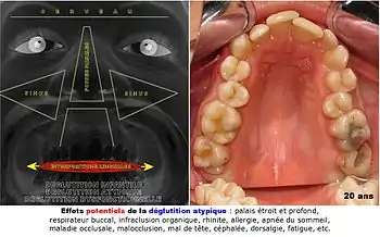 - La déglutition atypique touche plus de 75 % des adultes. Elle se caractérise par le réflexe d'étalement horizontal de la langue entre les deux arcades dentaires, des dents cliniquement trop petites, des « encombrements » dentaires (manque de place, bruxisme), des mâchoires « trop petites » (ODF : « contenant dentaire »), un palais étroit et profond, des fosses nasales étroites (stagnation des sécrétions, proliférations bactériennes), des sinus peu développés (ventilation pauvre, sinusites) et une hypoacousie (trompe d'Eustache peu perméable). Toutes ces caractéristiques forcent la patient à respirer par la bouche (respiration buccale). Les irritations des voies respiratoires sont fréquentes et diverses, voire estivales, telles amygdalite (grosses amygdales, angine, odynophagie), « refroidissements » (rhume, rhinite, pharyngite, trachéite, bronchite), allergie ou rhume des foins, sinusite, aigüe ou chronique. D'autres signes peuvent se greffer sur ce terrain déjà favorable aux agressions du milieu extérieur : acouphènes, otites, ronflements, apnées obstructives du sommeil, mort subite, etc.