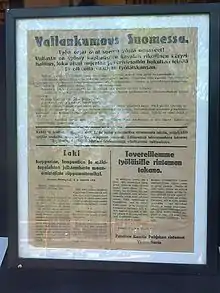 Dans la nuit du , le comité exécutif ordonne aux Gardes rouges d'arrêter les membres du sénat, dirigés par Pehr Evind Svinhufvud et de nombreux autres grands hommes politiques de droite, dont 33 membres du parlement[4]. Cependant, cela échoue complètement. L'état-major suprême des Gardes rouges reporte le coup d'État d'une journée en raison de préparatifs inachevés, de sorte que les sénateurs sont informés du mandat d'arrestation à leur encontre, par un document public distribué prématurément ce qui leur donne juste le temps de se cacher. La réunion du Parlement du est bloquée et quelques membres sont arrêtés.