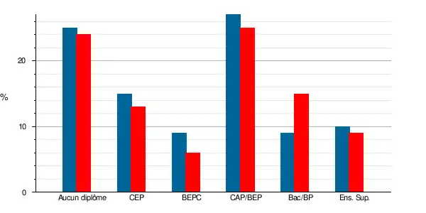 | Titulaires du certificat d'études primaires | 23 | 13 % | 23 | 15,3 % | 12,4 | 19 | 11,1 | 17,6 |