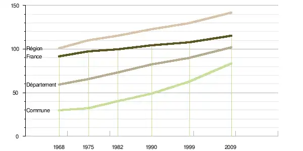 | Densité moyenne (hab/km²) | 29,4 | 32 | 39,6 | 49,3 | 62,4 | 83 | 102,2 | 141,3 | 114,8 |