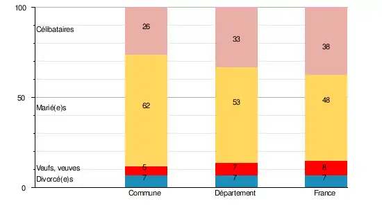 En 2009, la commune comptait 26,4 % de célibataires, 61,7 % de personnes mariées, 5,2 % de veufs ou veuves et 6,7 % de divorcé(e)s[11]. Le taux de personnes mariées apparaît ainsi très supérieur à celui du département (52,5 %)[12] mais aussi de la France (47,5 %)[13].