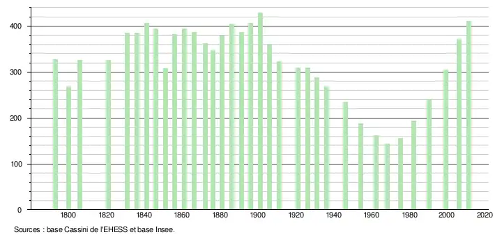 L'évolution du nombre d'habitants est connue à travers les recensements de la population effectués périodiquement dans la commune depuis 1793. Après avoir présenté un maximum en 1901 avec 428 habitants, la population de la commune diminue jusqu'en 1968 avec un minimum à 143 habitants puis croît ensuite relativement fortement.