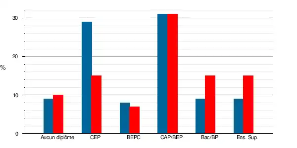 | Titulaires du certificat d'études primaires | 44 | 14,7 % | 65 | 29 % | 11,2 | 18,4 | 11,1 | 17,6 |