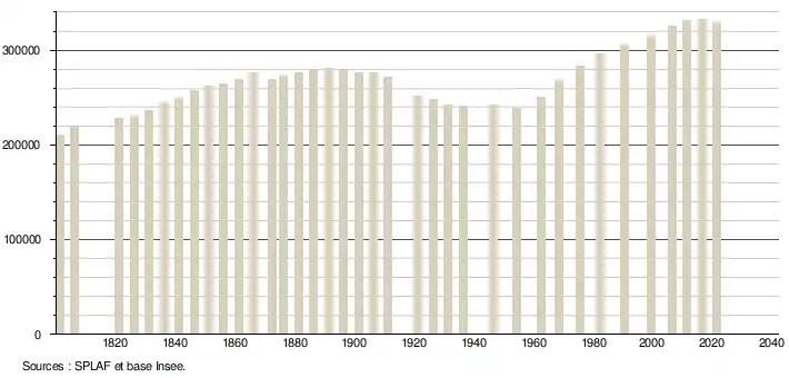 L'évolution démographique entre les guerres de 1870 et de 1914 est beaucoup plus faible qu'au niveau national. Sur cette période, la population ne s'accroît que de 2 430 habitants, soit un accroissement de 0,90 % alors qu'il est de 10 % au niveau national. La population baisse de 4,22 % pour la période de l'entre-deux guerres courant de 1921 à 1936 alors qu'elle croit au niveau national de 6,9 %.