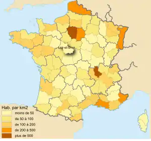 La densité de population de Loir-et-Cher, 51,8 habitants par kilomètre carré en 2021, est deux fois inférieure à celle de la France entière qui est de 106,5 hab./km2 pour la même année.
