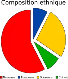 Composée en majorité de Nauruans, la population comprend également des Chinois, des Océaniens et des Occidentaux. La langue officielle est le nauruan (l'anglais étant également très parlé) et la religion principale est le christianisme (majoritairement protestantisme)[13].