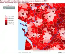 - les régions touristiques : île de Ré, île d'Oléron, cantons de Marennes et Saujon : là encore, la structure de la population active (tournée vers le commerce et le tourisme) explique que beaucoup d'habitants travaillent à proximité de leur domicile ;