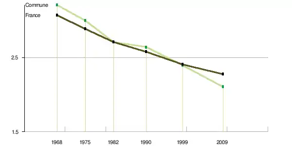 Le nombre de ménages[Note 3] tend à croître plus vite que la population : + 1,72 % par an en moyenne en France métropolitaine pour le nombre de ménages entre 1968 et 2009, + 0,74 % pour la population (tableau ci-après). Le nombre moyen de personnes par ménage tend en effet à baisser : égal à 3,06 en 1968, il n’est plus que de 2,4 en 1999 et de 2,27 en 2009[16]. La tendance est similaire pour la commune. Le nombre moyen de personnes par ménage tend également à baisser : égal à 3,2 en 1968, il n’est plus que de 2,39 en 1999 et de 2,1 en 2009[13].
