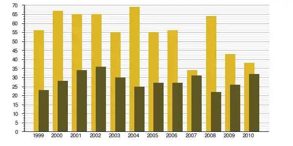 | 1968 à 1975 | 1975 à 1982 | 1982 à 1990 | 1990 à 1999 | 1999 à 2009 | ||
