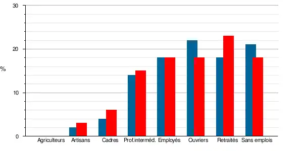 | Artisans, commerçants, chefs d'entreprise | 96 | 3,1 | 56 | 1,9 | 3,7 | 4,2 | 3,3 | 3,5 |
