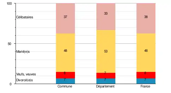 En 2009, la commune comptait 36,8 % de célibataires, 48,2 % de personnes mariées, 7,8 % de veufs ou veuves et 7,2 % de divorcé(e)s[13]. Le taux de personnes mariées apparaît ainsi inférieur à celui du département (52,5 %)[14] et supérieur à celui de la France (47,5 %)[15].