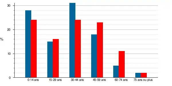 La population a vieilli entre 1999 et 2009, le taux des personnes de 60 ans et plus passant de 7 % à 13 %, à l'instar des populations du département et de la France qui sont aussi passées respectivement de 18 à 20 % pour le Département et de 20 à 23 % pour la France métropolitaine.