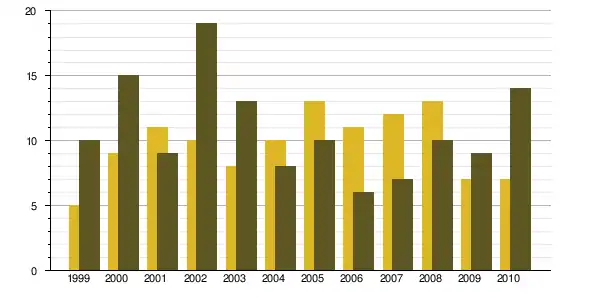 | 1968 à 1975 | 1975 à 1982 | 1982 à 1990 | 1990 à 1999 | 1999 à 2009 | ||