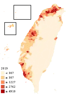 ![]() Carte des densités de population à Taïwan. |