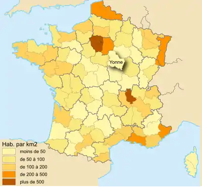 La densité de population de l'Yonne, 44,9 habitants par kilomètre carré en 2021, est deux fois inférieure à celle de la France entière qui est de 106,5 hab./km2 pour la même année.