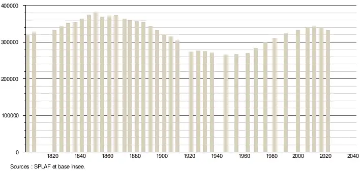 Avec 352 487 habitants en 1831, le département représente 1,8 % de la population française, qui est alors de 32 569 000 habitants. De 1831 à 1866 où il atteint son apogée, il va gagner 20 102 habitants, soit une augmentation de 0,16 % moyen par an, très inférieur au taux d'accroissement national de 0,48 % sur cette même période.