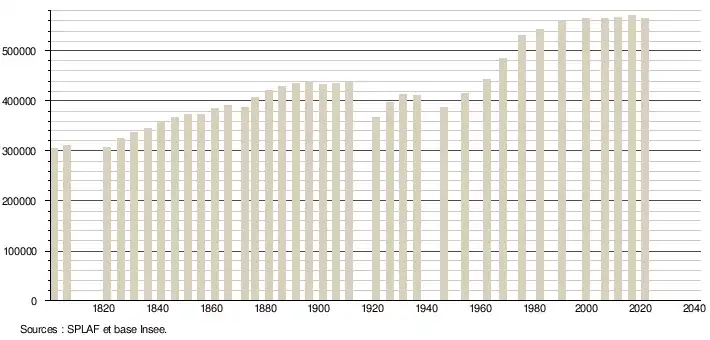 - Population municipale légale en vigueur au 1er janvier 2024, millésimée 2021, définie dans les limites territoriales en vigueur au 1er janvier 2023, date de référence statistique : 1er janvier 2021.