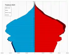 En 2023, la population de la Thaïlande est de 66 052 615 habitants ; il y a 32 224 008 hommes et 33 828 607 femmes ; 65 061 190 sont de nationalité thaïlandaise et 991 425 sont étrangers[13].