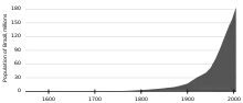 En juillet 2012, la population brésilienne atteint près de 194 millions d'habitants, soit quelque trois millions de plus qu'en 2010, selon une estimation de l'Institut brésilien de géographie et des statistiques (IBGE)[18]. La croissance démographique du Brésil a considérablement diminué au cours des dernières décennies en raison d'une baisse du taux de fécondité. En 2022, l'IBGE donne le résultat du recensement à 203 millions. Pour la même année, l'ONU estime la population brésilienne à 215 millions, et le taux de fertilité à 1.63 enfants par femme[19].