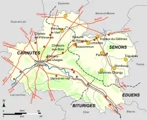 À la fin du IIIe siècle, les structures administratives changent. Le territoire de l'ancienne cité des Carnutes se trouve divisé en deux : Chartres ne garde que le nord, tandis qu'Orléans devient chef-lieu des Aureliani, nouvelle cité correspondant à la partie sud. Parallèlement, aux IIIe et IVe siècles, plusieurs agglomérations du nord du Loiret disparaissent comme Crottes-en-Pithiverais, Sceaux-du-Gâtinais et Beaune-la-Rolande[A 4].