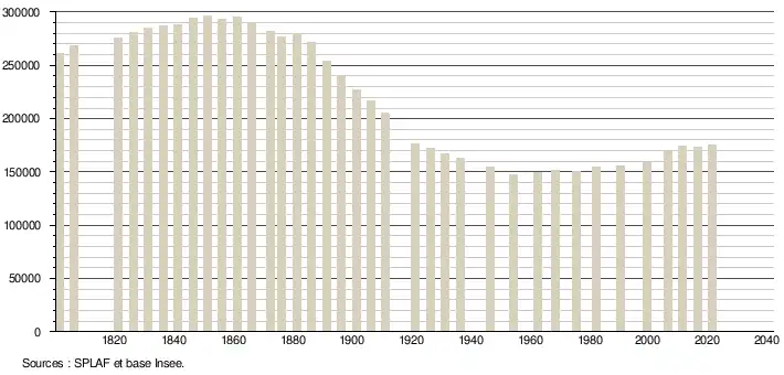 Avec 284 505 habitants en 1831, le département représente 0,87 % de la population française, qui est alors de 32 569 000 habitants. De 1831 à 1866, il va gagner 4 414 habitants, soit une augmentation de 0,04 % moyen par an, inférieur au taux d'accroissement national de 0,48 % sur cette même période.