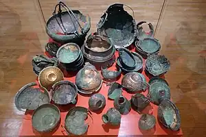 Ce service de vaisselle complet permettait de préparer, filtrer et distribuer un breuvage à plusieurs dizaines de personnes. Il est daté du milieu du Xe siècle av. J.-C.