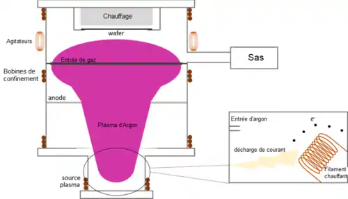 Le substrat (généralement un Wafer de silicium) est disposé dans la chambre du réacteur, où il est chauffé par derrière grâce à une résistance en graphite. Un plasma d'argon est introduit dans la chambre afin d'ioniser les molécules de précurseur, générant des radicaux hautement réactifs qui entraînent la croissance d'une couche épitaxiale sur le substrat. Le bombardement d'ions argons permet également d'éliminer les atomes d'hydrogène adsorbés à la surface du substrat sans provoquer de dommages structurels. Ces deux effets évitent les problèmes typiques de la croissance des alliages Si, Ge et SiGe par dépôt thermique en phase vapeur (CVD), qui sont