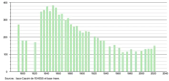 L'évolution du nombre d'habitants est connue à travers les recensements de la population effectués dans la commune depuis 1793. Pour les communes de moins de 10 000 habitants, une enquête de recensement portant sur toute la population est réalisée tous les cinq ans, les populations légales des années intermédiaires étant quant à elles estimées par interpolation ou extrapolation[24]. Pour la commune, le premier recensement exhaustif entrant dans le cadre du nouveau dispositif a été réalisé en 2006[25].