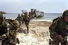 Les opérations de débarquement amphibie sont presque toujours précédées d'un bombardement aérien ou naval et très fréquemment d'une opération aéroportée.
