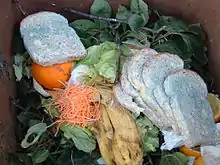 - les déchets putrescibles[39] : ce sont des déchets fermentescibles susceptibles de se dégrader spontanément dès leur production. Ils ont un pouvoir fermentescible intrinsèque. Exemples : déchets de légumes ou de fruits, déchets de viande, tontes de gazons, etc. À l'opposé, le bois, le papier et le carton qui peuvent être stockés séparément sans évolution notoire, ne sont pas putrescibles ;