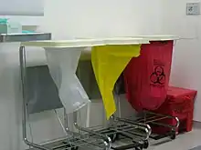 - Risques biologiques : il correspond au risques de contamination par des germes pathogènes ou des prions, pouvant conduire à une infection (nosocomiale, éventuellement) ou contamination. Certains déchets médicaux sont en effet vecteurs de virus, champignons ou bactéries susceptibles d'être sources de contamination inter-humaine ou zoonotique (ex : virus du sida, de l'hépatite B et C) ; c'est le cas des dispositifs médicaux souillés par des liquides biologiques (urines, matière fécale, sang, vomissures...) ou des objets piquants et tranchants potentiellement contaminés usagés, ces derniers présentant par ailleurs le risque de blessure majorant le risque d'une contamination. Une élimination non appropriée des dispositifs médicaux à usage unique, comme les aiguilles ou les seringues, peut entraîner le risque de recycler le dispositif pour réemballage et réutilisation, provoquant le risque de contamination si le matériel était déstérilisé ou souillé[11]. Certains déchets médicaux sont perturbateurs endocriniens.