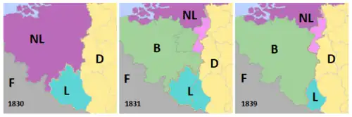 Malgré un premier traité signé dès 1831 (traité des XXVII articles)[4], il fallut attendre 1839 pour que les Pays-Bas reconnaissent les nouvelles frontières de la Belgique imposées par la conférence de Londres et que la scission du Luxembourg s’opère en échange de celle du Limbourg, via la ratification du traité des XXIV articles : la partie occidentale du grand-duché devenant la neuvième province de Belgique sous le nom de province de Luxembourg et la partie orientale restait propriété personnelle de Guillaume 1er.